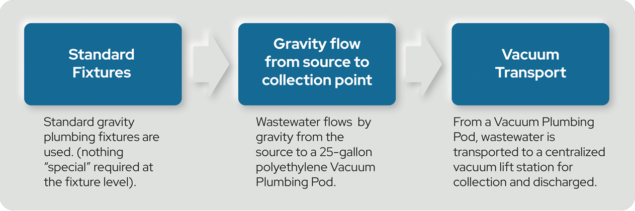 The difference is simple: the vacuum lift station includes dedicated vacuum pumps that efficiently transport wastewater from the Vacuum Plumbing Pods to the vacuum lift station.